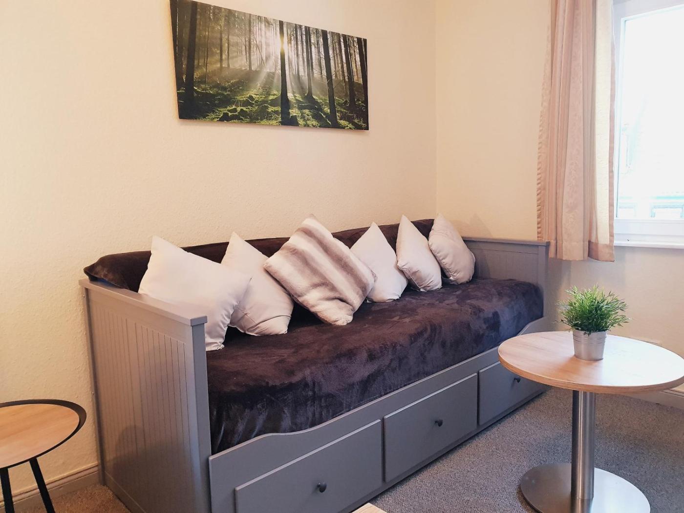 Studio mit Schlafsofa. The studio offers a wardrobe, a sofa, as well as a private bathroom featuring a shower and a hairdryer. Guests can make meals in the kitchenette that comes with a stovetop, a refrigerator, kitchenware and a microwave. The studio provides a flat-screen TV with satellite channels, a coffee machine, a seating area, a dining area as well as garden views. The unit offers 1 bed.