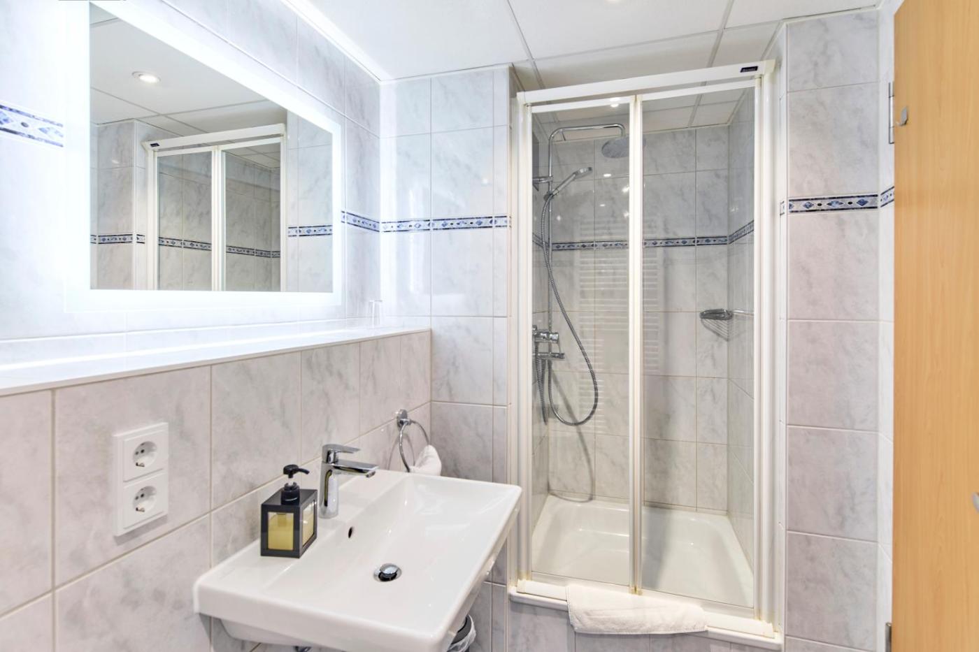 Einzelzimmer. Providing free toiletries, this single room includes a private bathroom with a shower and a hairdryer. The well-fitted kitchenette features a stovetop, a refrigerator, kitchenware and a microwave. The single room provides a flat-screen TV with satellite channels, soundproof walls, a seating area, a dining area as well as garden views. The unit offers 1 bed.