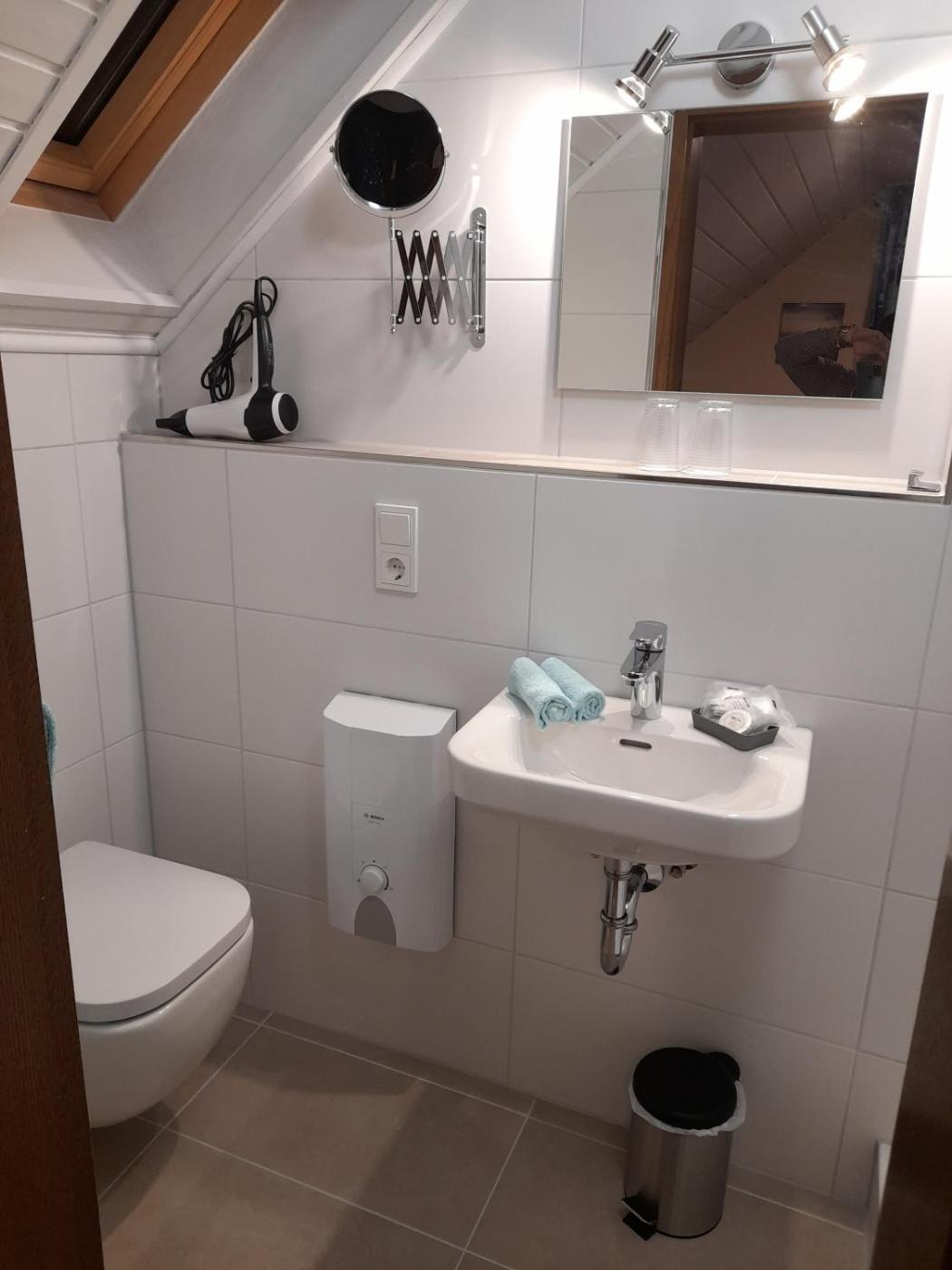 Doppelzimmer mit eigenem Bad. The double room includes a private bathroom equipped with a walk-in shower and a hairdryer. This double room features a dining area, heating, a flat-screen TV with cable channels and garden views. ;
