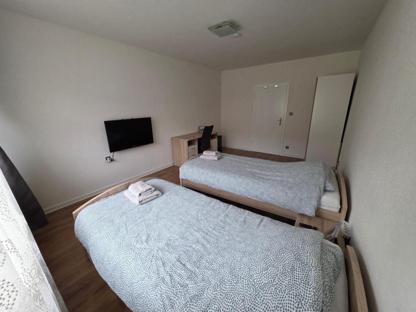 Zweibettzimmer mit Gemeinschaftsbad. The twin room offers a tea and coffee maker, a dining area, a wardrobe, heating and a flat-screen TV. The unit has 2 beds.