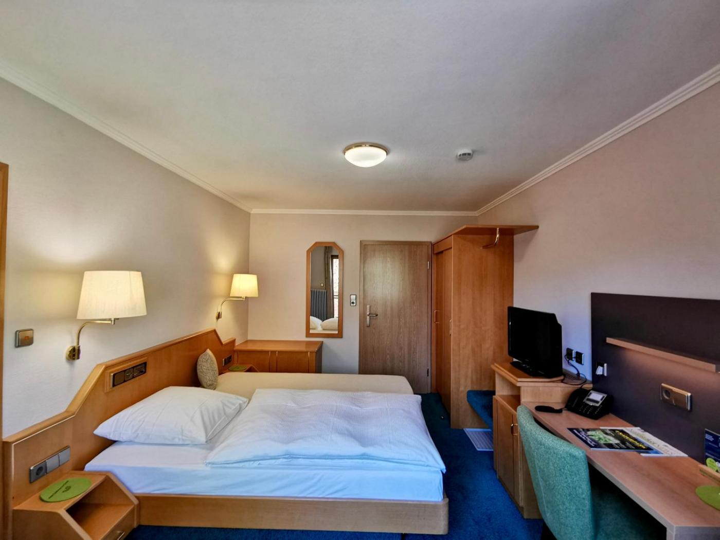 Standard Einzelzimmer. The single room features an electric kettle, a carpeted floor, as well as a private bathroom featuring a shower and a hairdryer. The single room provides a flat-screen TV with satellite channels, soundproof walls, a wardrobe, a safe deposit box as well as city views. The unit offers 1 bed. ;