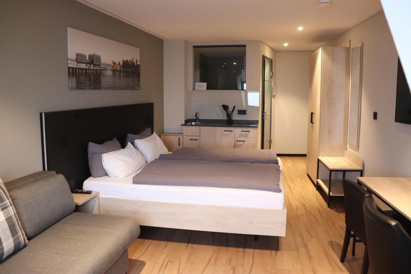 Doppelzimmer mit Zustellbett. The kitchenette is equipped with a stovetop, a refrigerator and kitchenware. The double room provides a tea and coffee maker, a wardrobe, as well as a private bathroom featuring a walk-in shower and a hairdryer. The unit offers 2 beds. ;