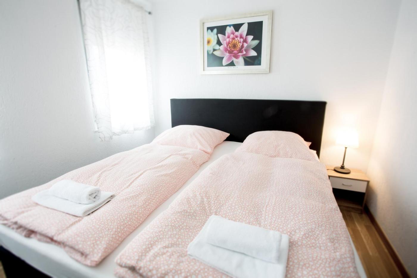 Zweibettzimmer mit Dusche. Die Wohneinheit ist mit 2 Betten ausgestattet.