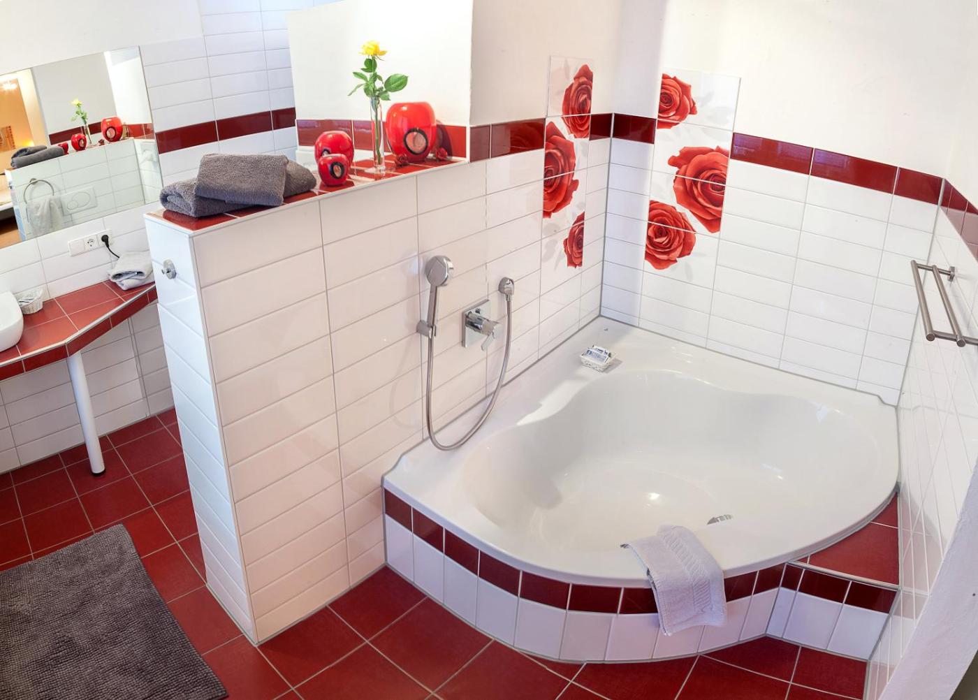 Comfort Blumenzimmer. Das helle Zimmer verfügt über einen Flachbild-TV und ein eigenes Bad. Dieses geräumige Zimmer verfügt über ein extra großes Doppelbett, eine Badewanne und eine ebenerdige Dusche. ;
