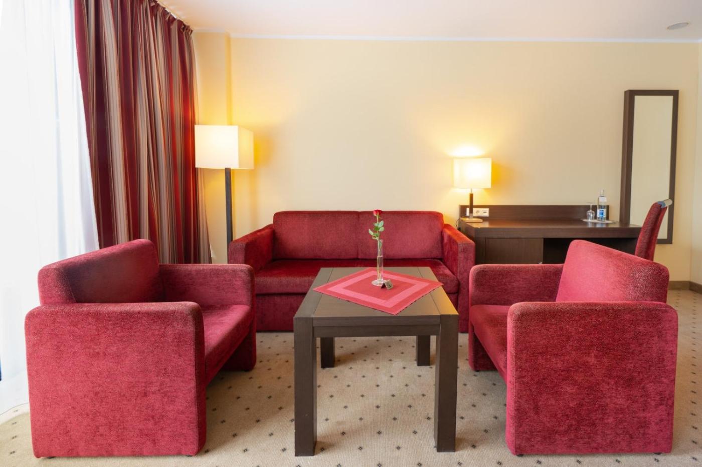 Junior Suite. Die klimatisierte Suite umfasst 1 Schlafzimmer sowie 1 Bad mit einer Badewanne und einem Haartrockner. Die Suite bietet zudem Tee- und Kaffeezubehör, einen Kleiderschrank, einen Safe, Teppichboden und einen TV. In der Wohneinheit befinden sich 2 Betten. ;