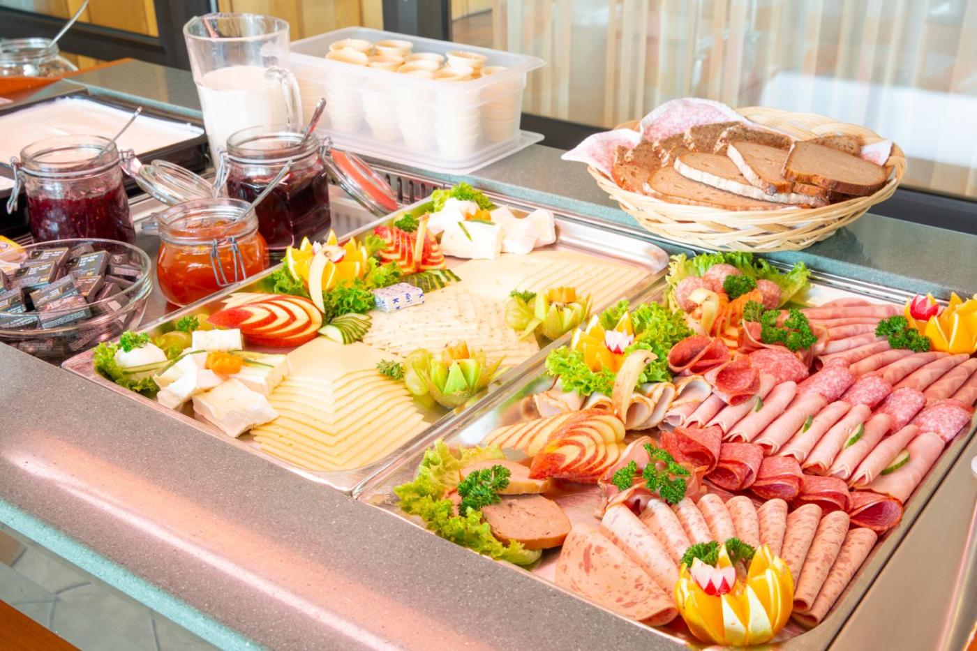 Gäste der Unterkunft Das Gästehaus Puschendorf können ein als Buffet angebotenes Frühstück genießen.