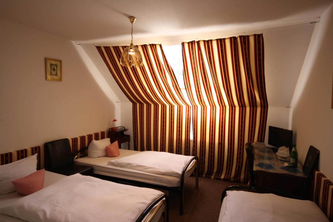 Dreibettzimmer. Individuell eingerichtetes Zimmer mit einem TV, einer Mikrowelle und einem eigenen Bad mit einem Haartrockner.