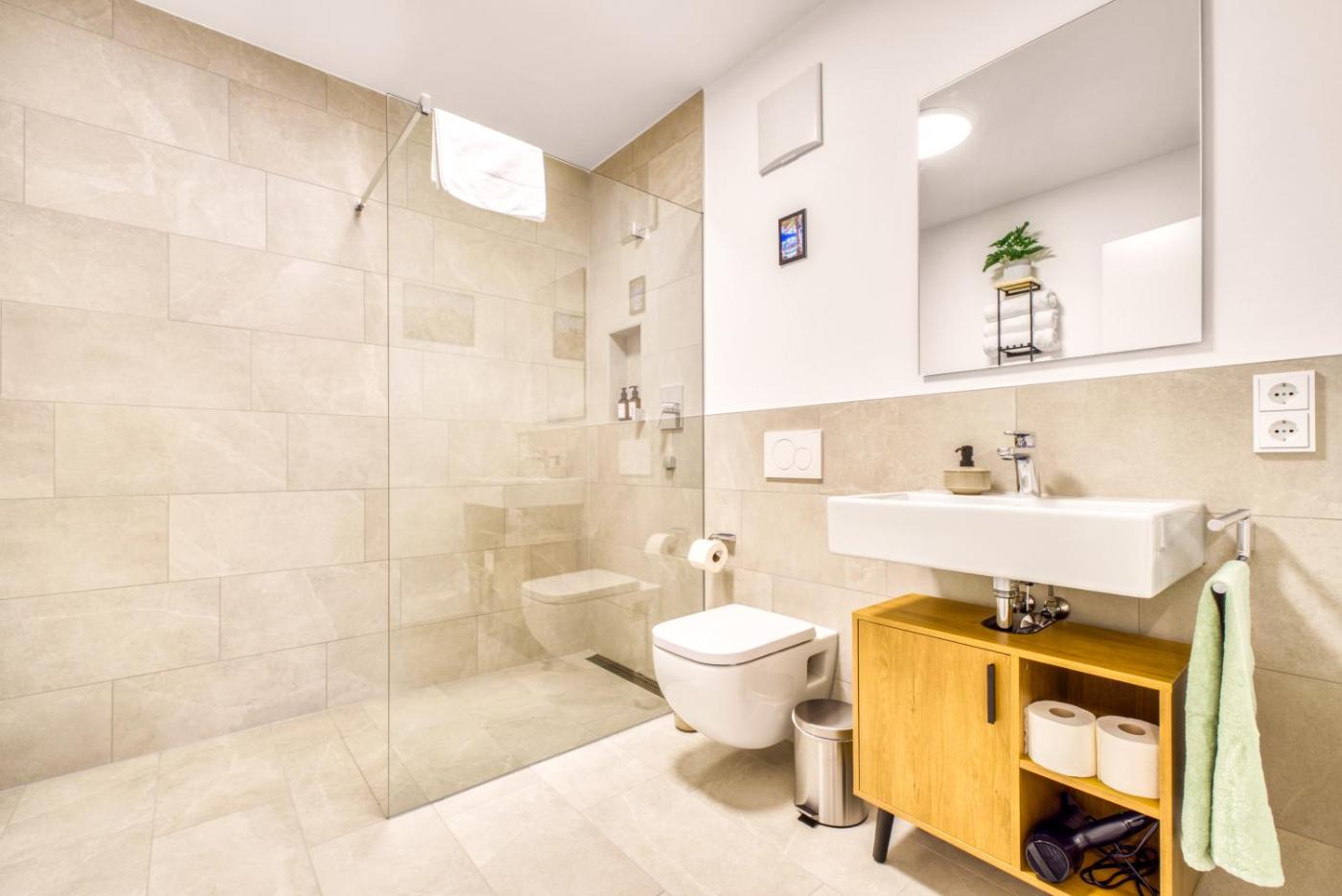 Apartment mit 2 Schlafzimmern. This spacious apartment consists of a kitchen, a seating area, 2 separate bedrooms and 1 bathroom with a walk-in shower and a hairdryer. The fully equipped kitchen features a stovetop, a refrigerator, a dishwasher and kitchenware. The apartment provides a washing machine, a tea and coffee maker, a dining area, a dressing room and a flat-screen TV with streaming services. The unit offers 2 beds.