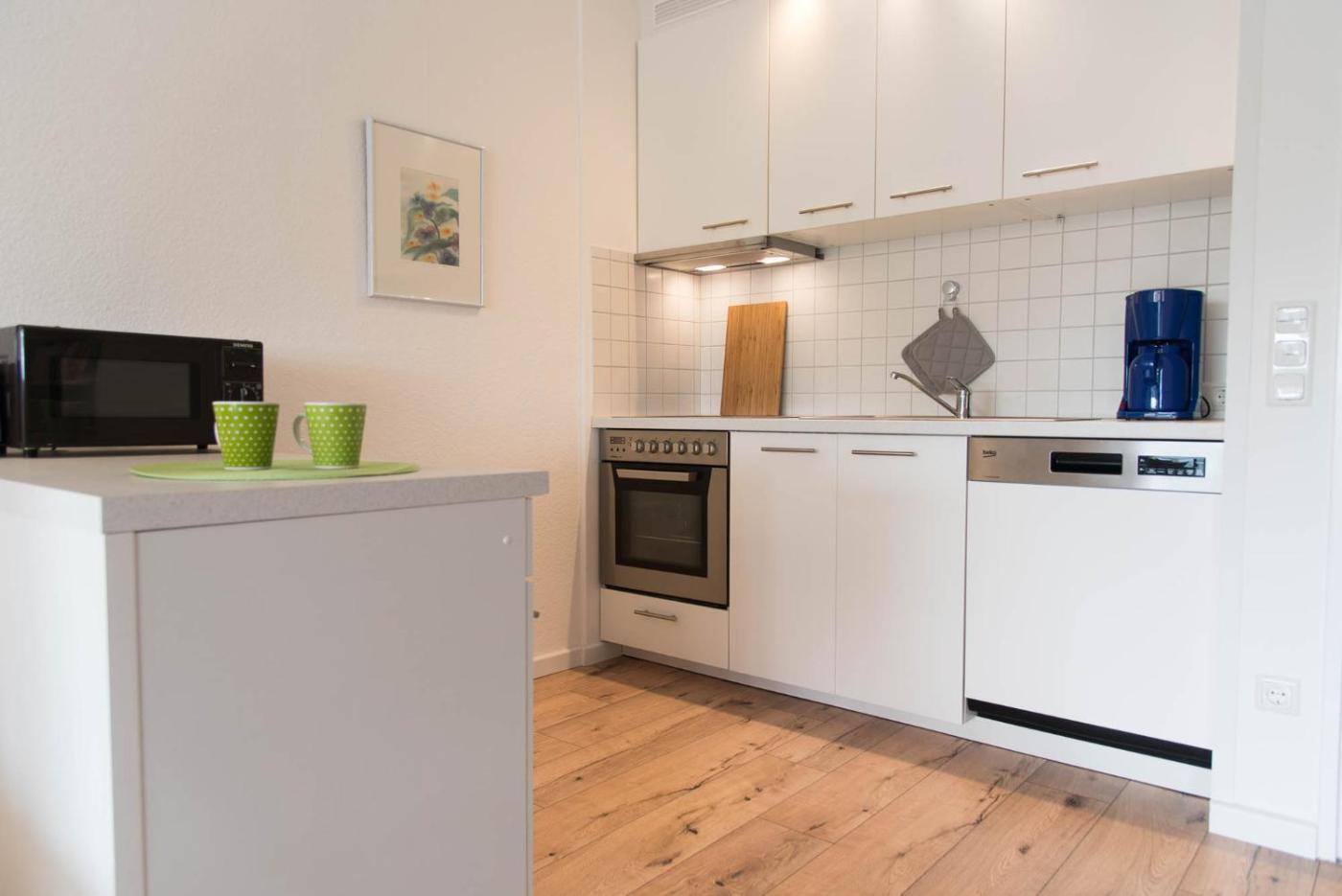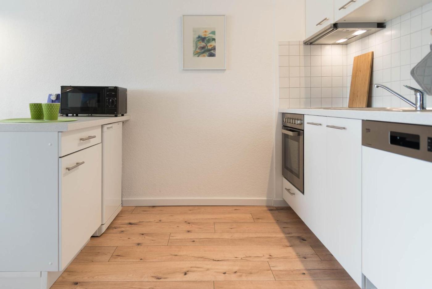 Die Küche ist versehen mit einem Kühlschrank und einem Geschirrspüler, einem Ofen sowie einer Kaffeemaschine und einem Wasserkocher.