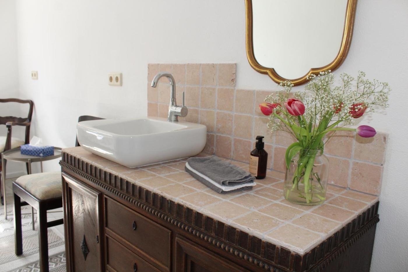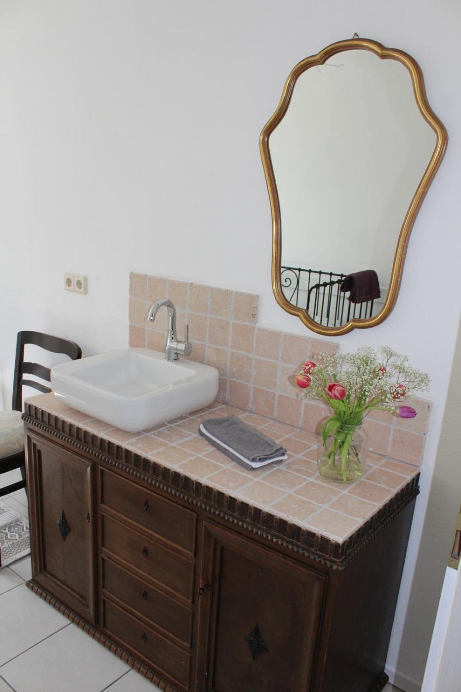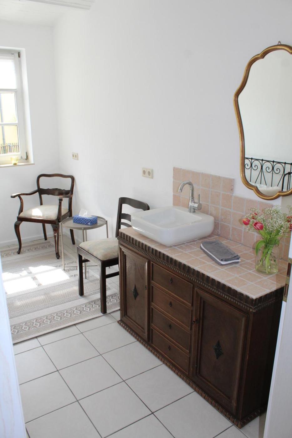 Doppelzimmer mit Gemeinschaftsbad. Offering a seating area, a wardrobe and an electric kettle, this double room includes a shared bathroom. The double room offers a tiled floor, heating and ancourtyard view. The unit has 1 bed. ;