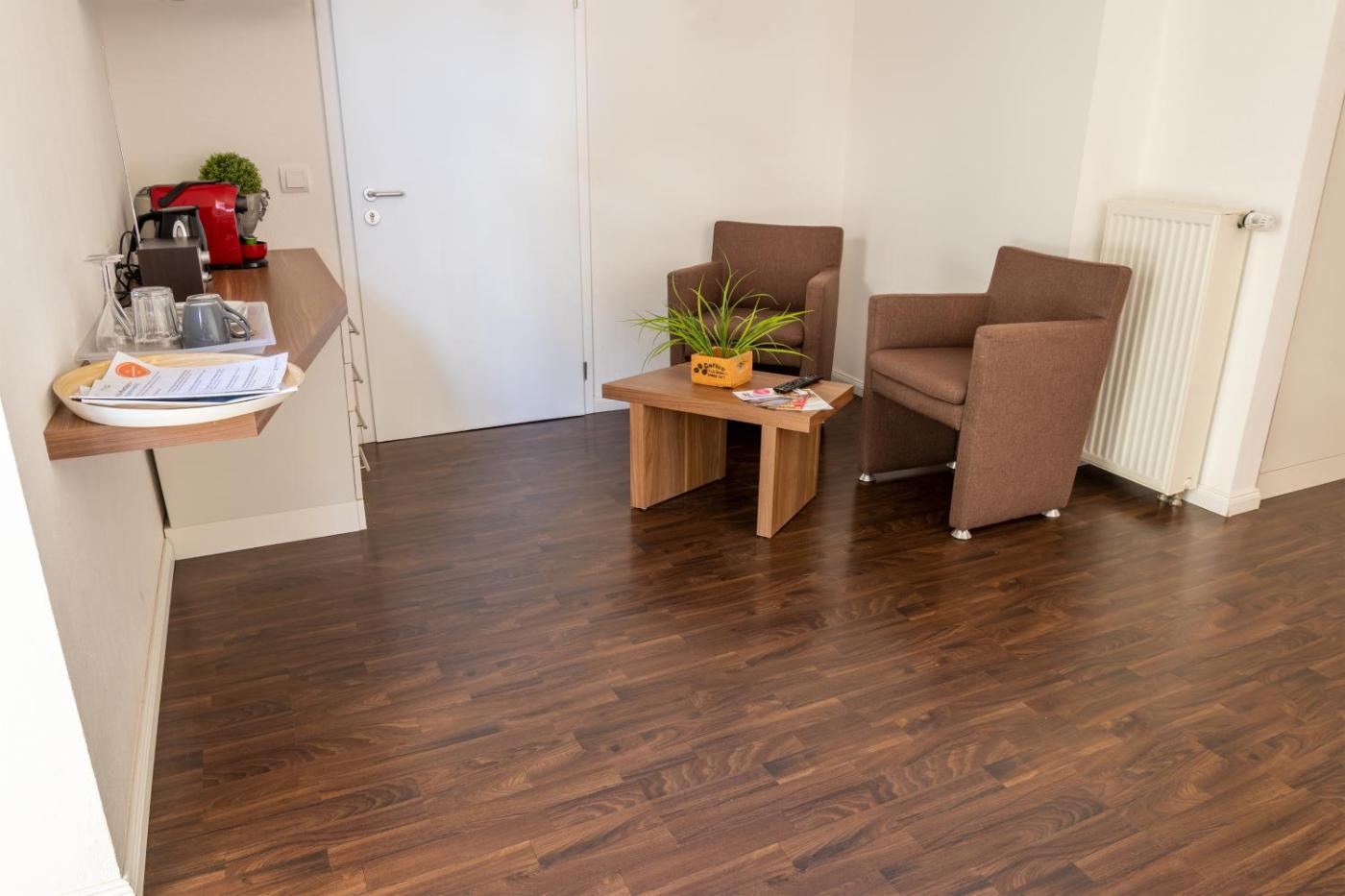 Doppelzimmer - 9. Dieses Doppelzimmer verfügt über eine Kaffeemaschine, einen Sitzbereich sowie ein eigenes Bad mit einer ebenerdigen Dusche und einem Haartrockner. Zu den weiteren Einrichtungen des Doppelzimmers gehören ein Kleiderschrank, ein Safe, Parkett, Heizung und ein Flachbild-Kabel-TV. Die Wohneinheit ist mit 1 Bett ausgestattet.