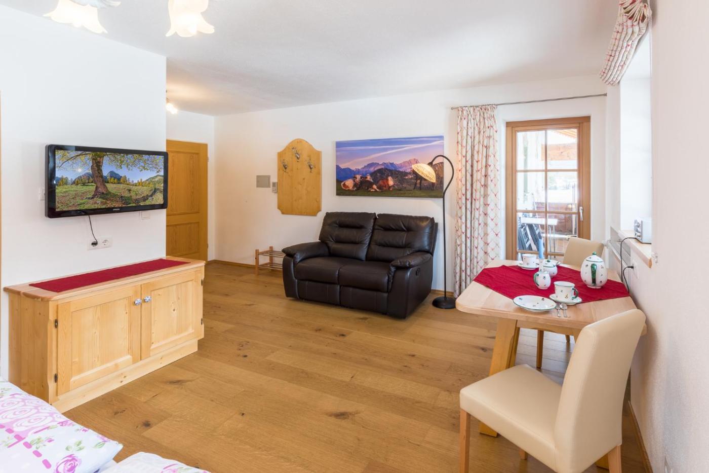 Standard Apartment mit Bergblick. Small and comfortable apartment, 36 sqm, a large room with bedroom, fully equipped kitchenette, kettle, coffee machine, dining area, bathroom with rain shower & underfloor heating, flat screen + satellite TV, Balcony to the east, southwest with loggia. Views of the Schöttlkarspitze, Karwendel and Wetterstein mountains. ;
