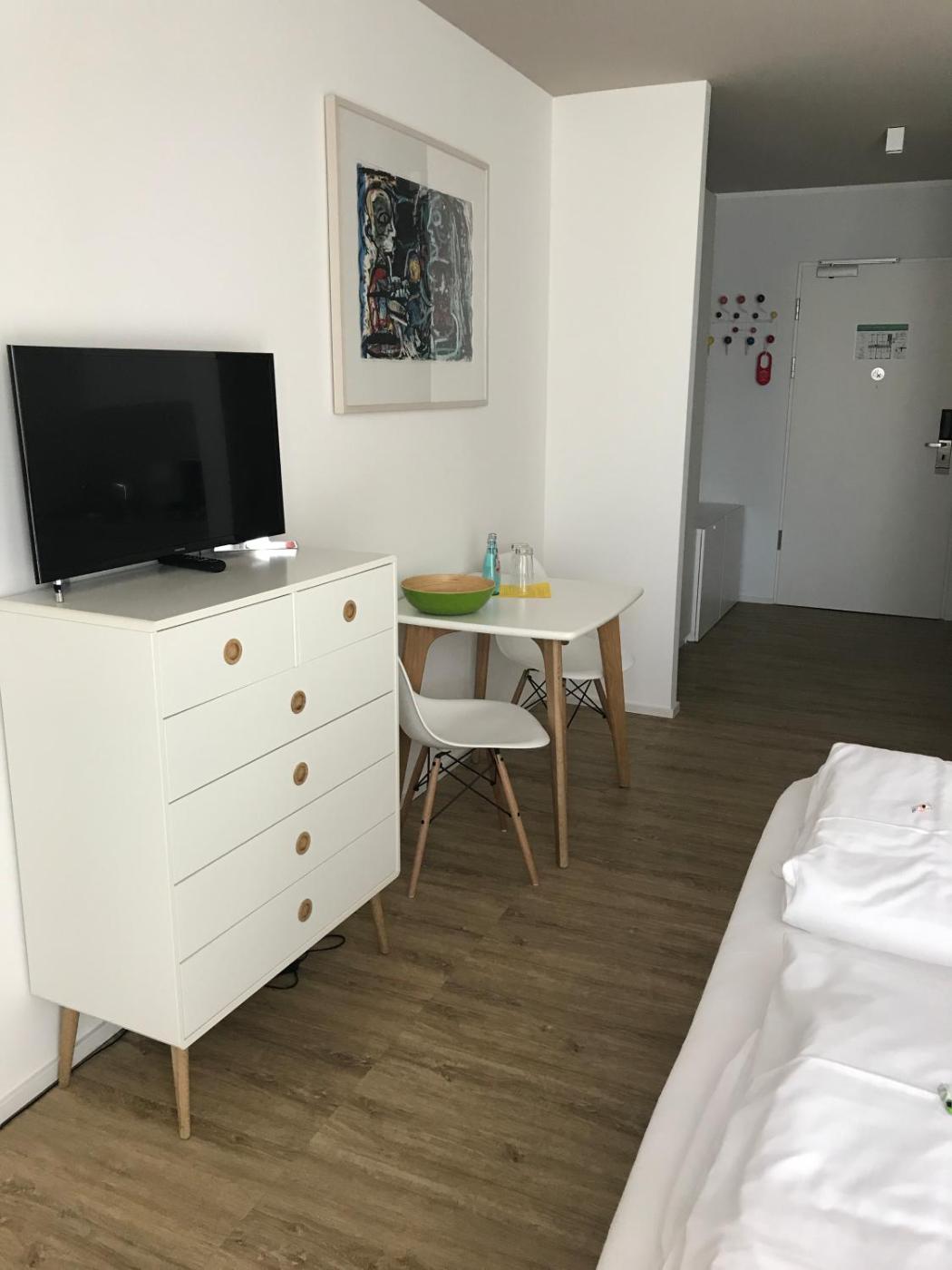 Standard Doppelzimmer. Dieses Standard Zimmer bietet Platz für maximal 2 Personen. Die Unterkunft besteht aus einem Wohn-Schlafzimmer mit einem Ess-Arbeitstisch und einem HD-TV, einer Küchenzeile mit Kochmöglichkeiten und einem Kühlschrank sowie einem eigenen Bad mit einer Dusche. Kostenlose Pflegeprodukte liegen für Sie bereit. ;