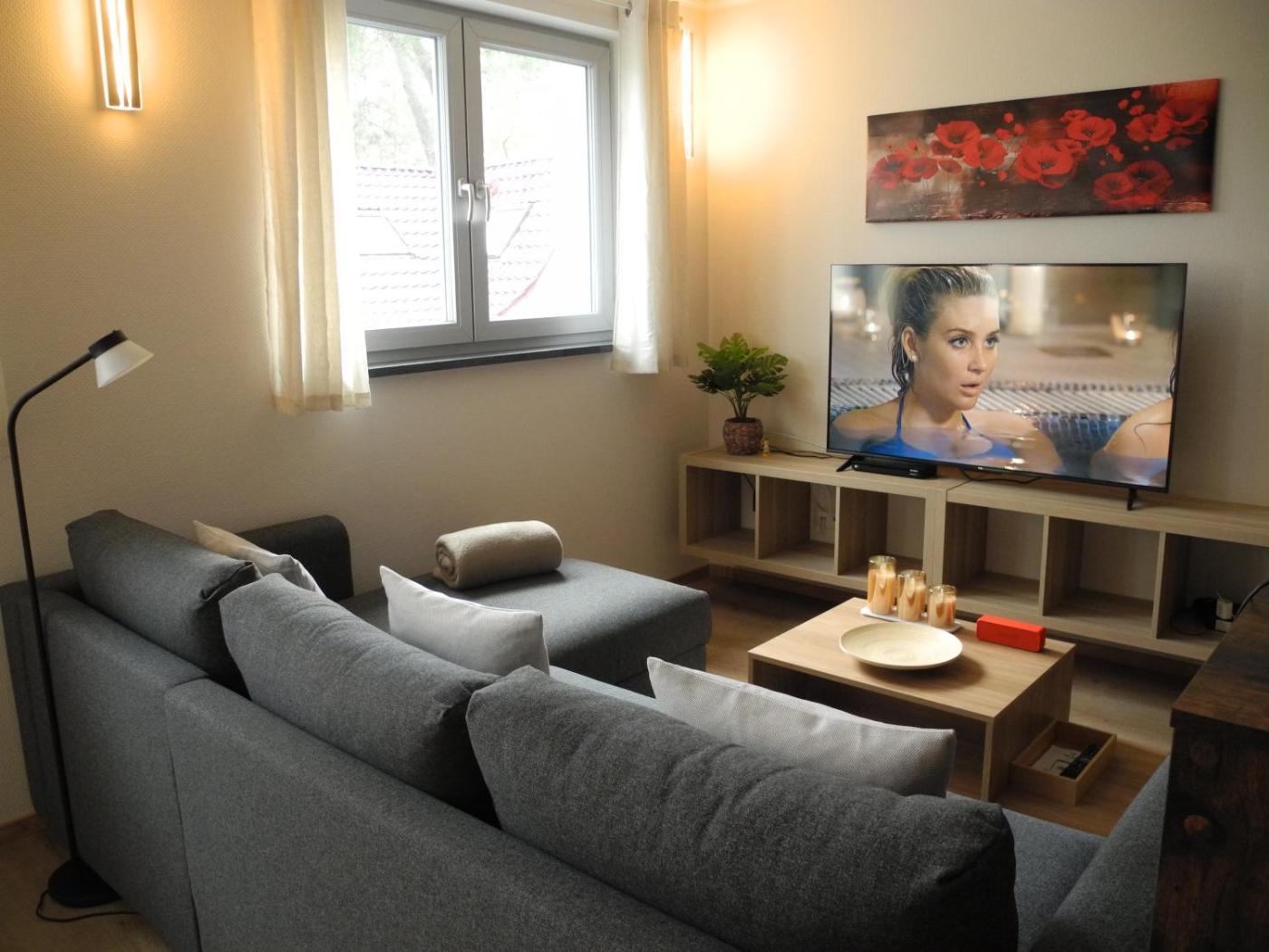 Apartment mit 2 Schlafzimmern. In the kitchen, guests will find a stovetop, a refrigerator, a dishwasher and kitchenware. The spacious air-conditioned apartment offers a flat-screen TV with streaming services, a washing machine, a private entrance, a tea and coffee maker as well as garden views. The unit has 1 bed.