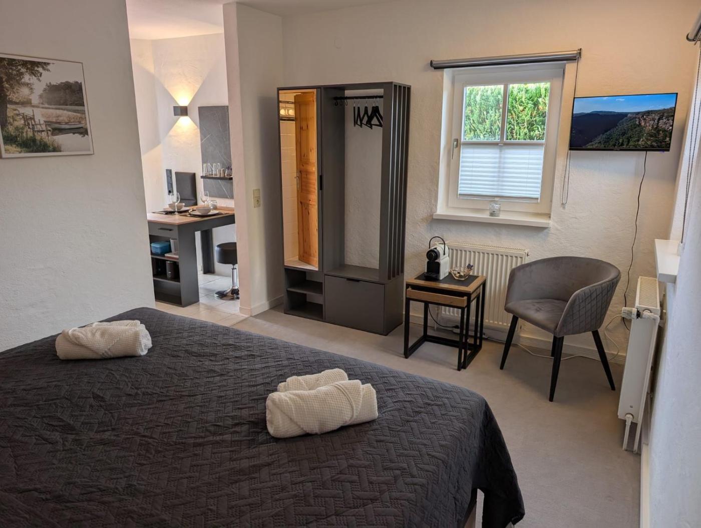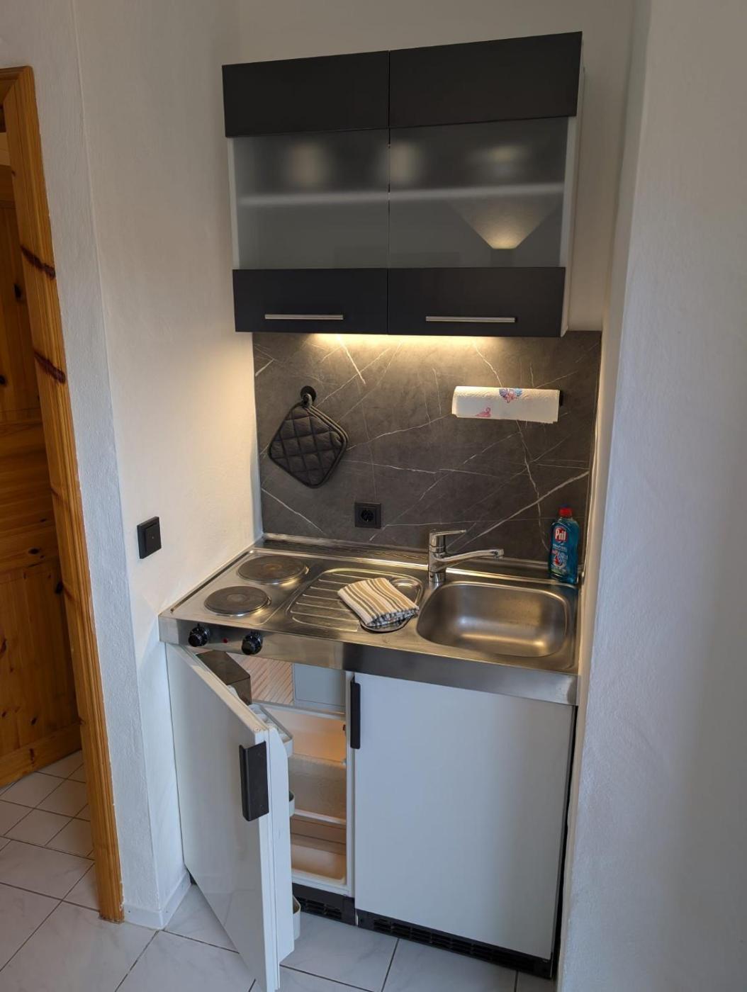 Apartment mit 1 Schlafzimmer und Dusche. This apartment comprises 1 bedroom, a kitchenette and 1 bathroom with a bath and a shower. The kitchenette is equipped with a refrigerator, a toaster and an electric kettle. This apartment features a carpeted floor, heating and a flat-screen TV. The unit offers 1 bed.